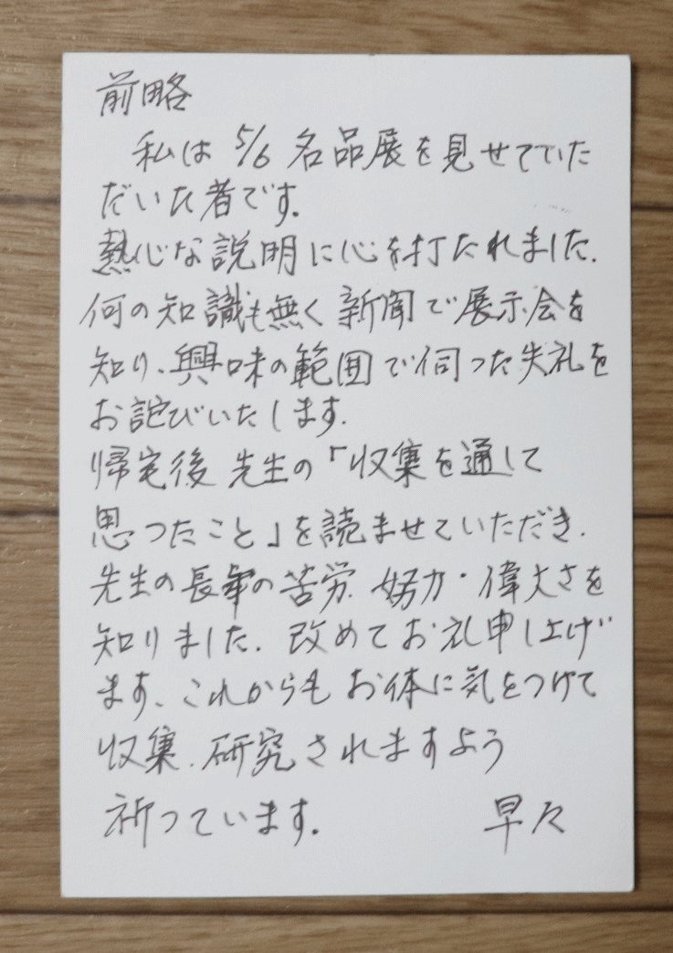 当館は現在、浮世絵約500点、伊万里の金襴手陶磁器約100点、中国陶磁器100点京都西陣手描き染見本200点余り、所蔵しています。季節に合わせて展示していきますので、どうぞ、ご来館して、展観していただきたいと思います。