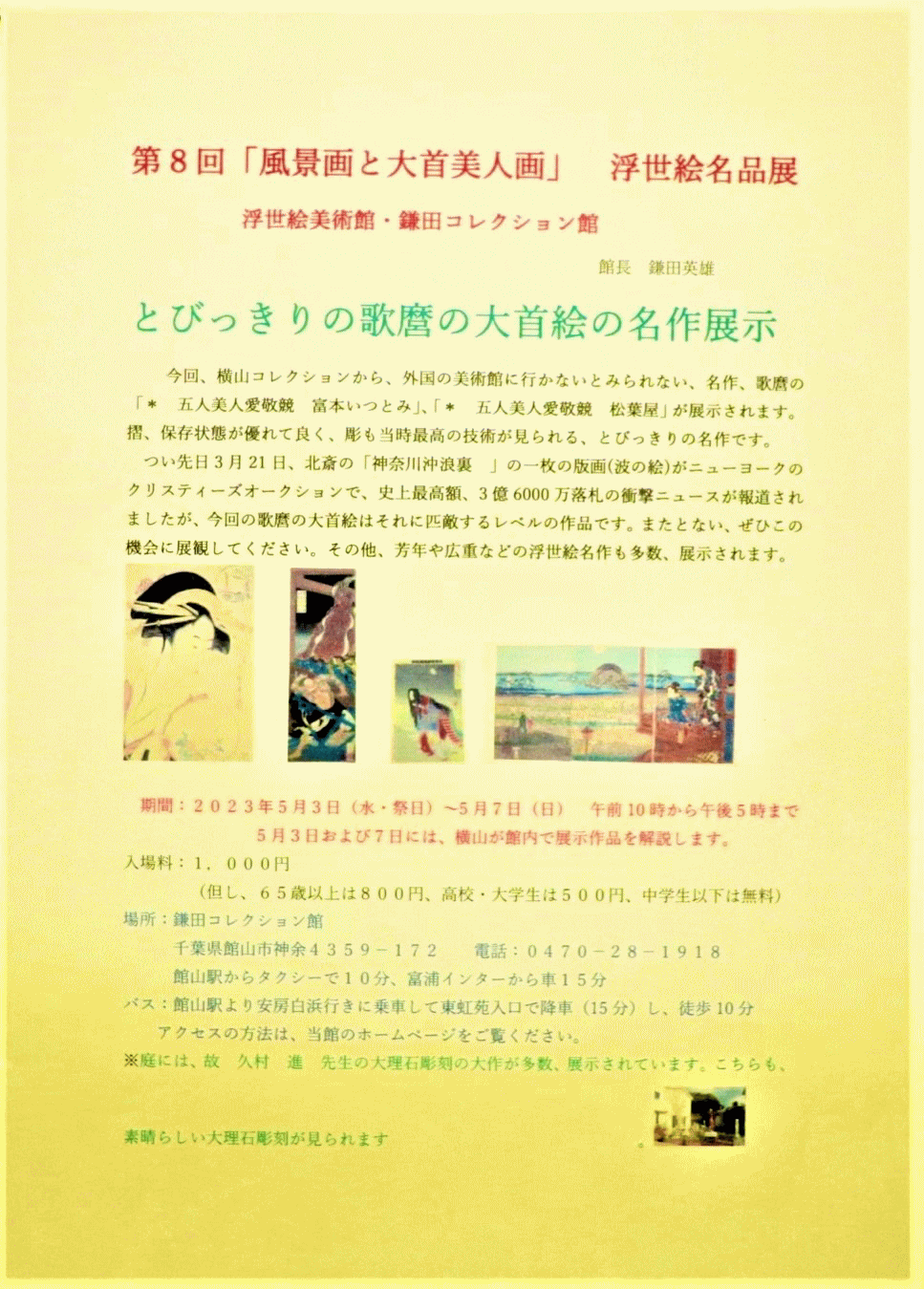 第8回「風景画と大首美人画の展覧会」を、左記の通り開催する運びとなりました。 今回は、横山コレクションの歌麿の美人画大首絵の名品は国内ではめったに見られないものとなっています。また、芳年の武者絵の金剛伸像など展示し、また、野外には、展示準備に一年を要した、故、久村進の大理石彫刻巨匠の作品が完璧に展示完了し、見事なまでの、展観の運びになりました。皆様方に存分に楽しんでいただけるものと確信しています。