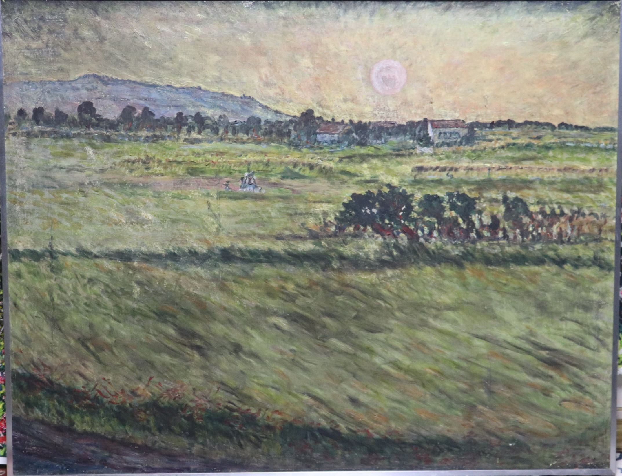 木枠カンヴァスを持っていけないので、カンヴァス布地だけ切り取っていったいうエピソードがあるので、本作品も、そのため、切り取られた可能性があり。―――――その後、所有者が、木枠に張り付けたものと推測できる。作品を最大限にぎりぎりに木枠に張り付けてある。